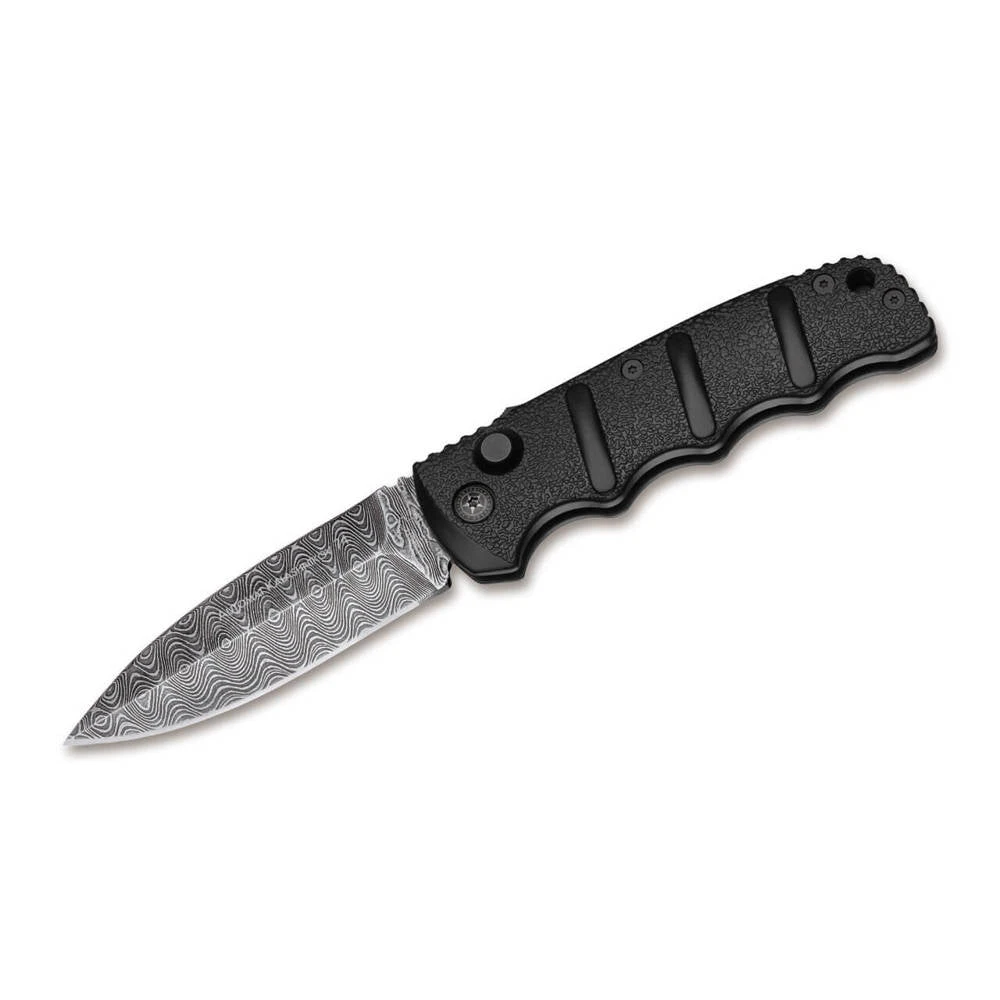 La lame en pointe de lance de ce couteau automatique fait vibrer le Damas finement marbré (192 couches, forgé) et le transforme en un objet de collection exclusif mais abordable.