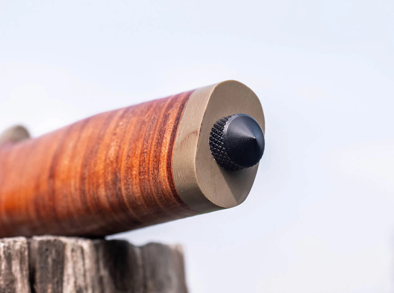 La poignĂ©e et le bouton d’extrĂ©mitĂ© ne sont pas en mĂ©tal comme d’habitude, mais en G10 lĂ©ger et extrĂŞmement rĂ©sistant. Cela se traduit par une rĂ©duction de poids significative et, en combinaison avec le manche brun en cuir enveloppĂ© et la lame revĂŞtue de noir, donne au couteau une apparence moderne et attrayante.