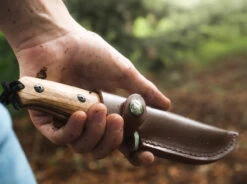 La lame Ă pointe tombante lĂ©gèrement modifiĂ©e en acier inoxydable 440A s’Ă©tend sur l’ensemble du couteau, de la pointe Ă l’extrĂ©mitĂ© du manche, offrant ainsi une Ă©norme stabilitĂ©.