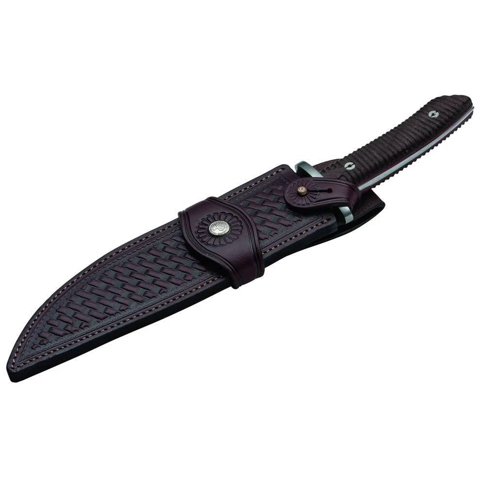 Le couteau est livrĂ© avec un Ă©tui en cuir, qui protège la lame lorsque le couteau n’est pas utilisĂ©. Cet Ă©tui est Ă©galement pratique pour le transport du couteau.