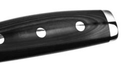 Le manche est en Micarta Canvas en rĂ©sine noire et lin, approuvĂ© par la FDA, avec trois rivets en acier inoxydable. Le matĂ©riau en toile est teint en noir et prĂ©sente une finition brillante pour durer des dĂ©cennies. L’embout gravĂ© du manche est en acier inoxydable 18/10, ce qui lui confère une stabilitĂ© et un Ă©quilibre exceptionnels.Â