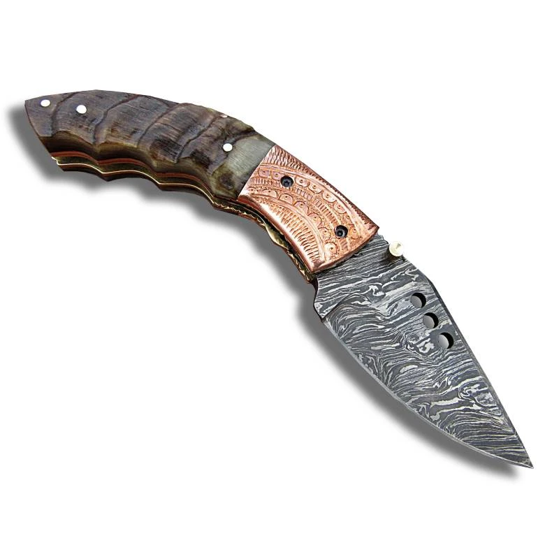 Couteau pliant  avec manche en corne et lame damas Firestorm 176 couches.