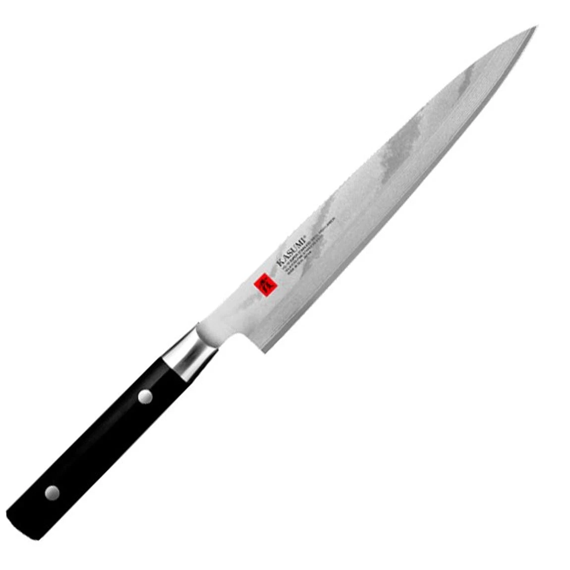 Le couteau yanagiba de 210mm Kasumi. Couteau Ă poisson typique du Japon, le Yanagiba est aiguisĂ© d’un seul cĂ´tĂ©. Ce modèle convient donc aux droitiers. Souvent appelĂ© couteau Ă sashimi, il peut ĂŞtre employĂ© pour la prĂ©paration des makis ou pour lever des filets de poisson.